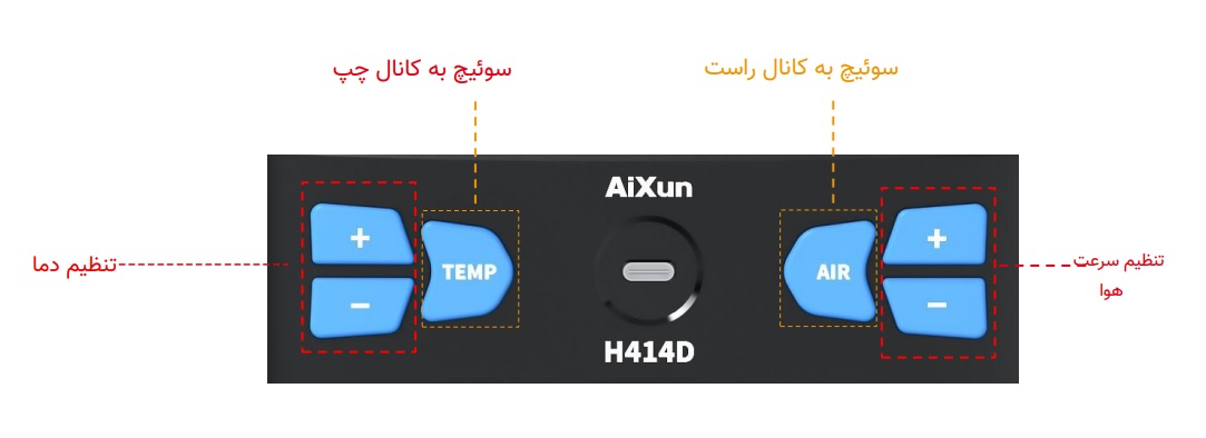 هر کانال از سیستم دمنده هوای گرم، به طور مستقل کنترل میشود و دارای پایه استند فلزی اختصاصی جهت قرارگیری دسته های هیتر در حالت آماده به کار می باشد.