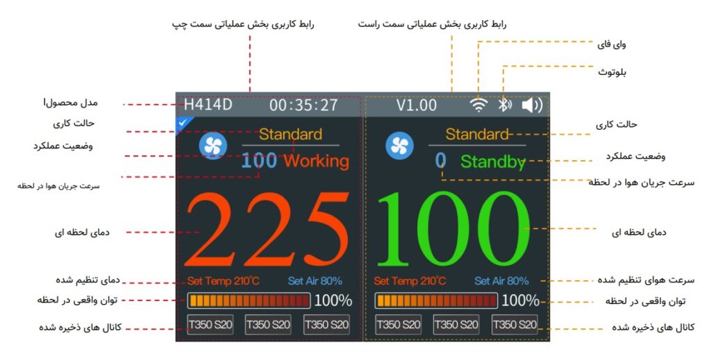 ⇐ این هیتر از کارکرد یککاناله و همچنین کارکرد همزمان دو کاناله پشتیبانی میکند.با برداشتن دسته از روی پایه در حالت آمادهباش، دستگاه بهصورت خودکار شروع به گرمشدن کرده و دما را تا مقدار تنظیمشده افزایش میدهد.