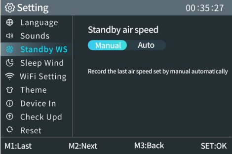 با یک بار فشار دادن مجدد دکمه M، وارد تنظیم سرعت هوا میشوید و میتوانید مقدار جریان هوا را تنظیم نمایید.