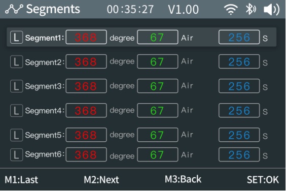 آیکون Segment را انتخاب کرده و دکمه SET را فشار دهید تا وارد صفحه تنظیمات شوید. با دکمههای M1 و M2 بین بخشهای مختلف ۱ تا ۵ جابهجا شوید. در هر بخش (Segment) سه مقدار قابل تنظیم وجود دارد: